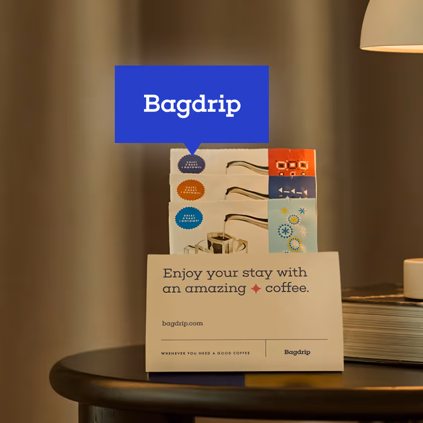 Goście pamiętają złą kawę hotelową przez lata. W recenzjach piszą o "nijakiej kawie rozpuszczalnej" i "okropnej kawie 3w1". Bagdrip to szansa, żeby kawa stała się punktem wyróżniającym Twój hotel. Prawdziwa kawa speciality, gotowa w 3 minuty, z Twoim logo na opakowaniu.
